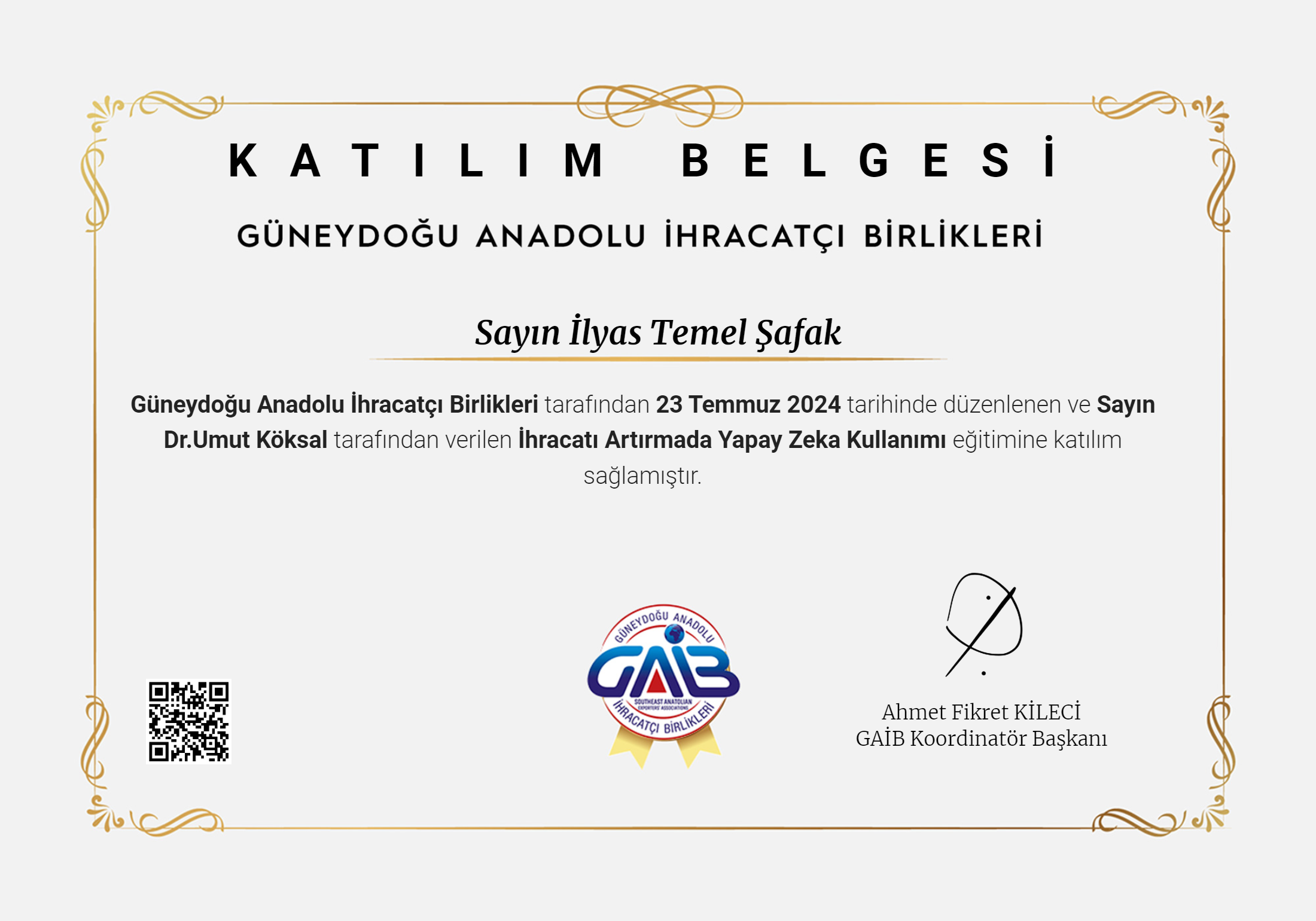 > Güneydoğu Anadolu İhracatçı Birlikleri – GAİB tarafından düzenlenen ve Sn. Dr. Umut Köksal tarafından verilen “İhracatı Artırmada Yapay Zekâ Kullanımı” çevrim içi eğitimine katılım sağladım.