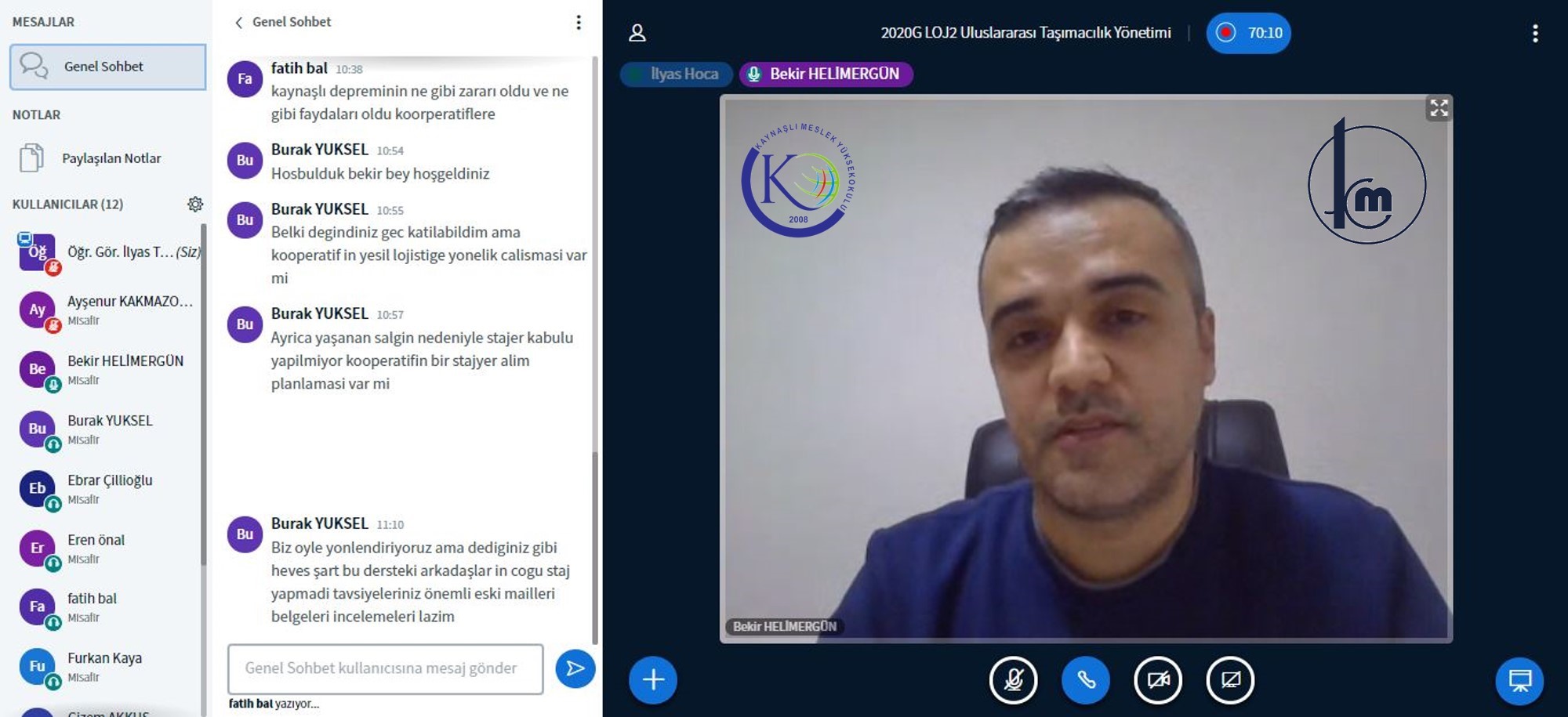 > Bugün, Kaynaşlı MYO Lojistik 2.Sınıf Uluslararası Taşımacılık Yönetimi dersimizde, her zaman samimi maddi ve manevi desteklerini gördüğümüz, S.S. Uluslararası Kaynaşlı Motorlu Taşıyıcılar Kooperatifi Yöneticisi Sn. Bekir Helimergün‘ü misafir ettik.