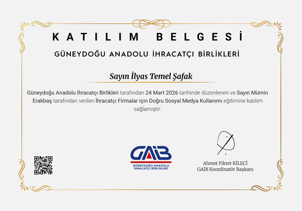 * Bugün Güneydoğu Anadolu İhracatçı Birlikleri (GAİB) tarafından düzenlenen “İhracatçı Firmalar İçin Doğru Sosyal Medya Kullanımı” çevrim içi eğitimini başarıyla tamamlayarak katılım belgemi aldım.