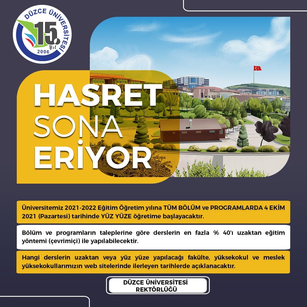 Yeni Dönem 4 Ekim 2021'de Başlıyor. Düzce Üniversitesi 2021-2022 Akademik Yılına Yüz Yüze Olarak Başlayacağız. Tüm öğrencilerimize ve çalışma arkadaşlarıma…